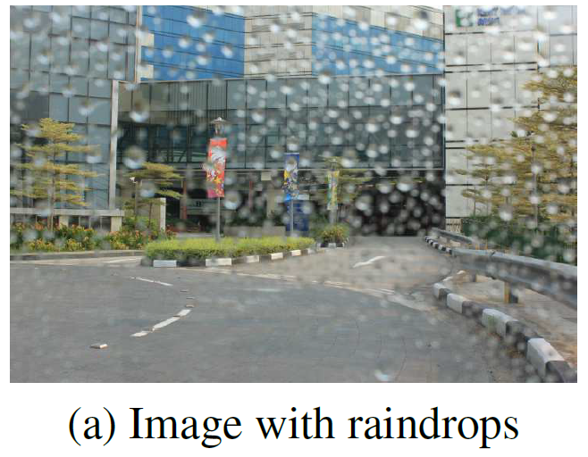 这篇文章考虑 Derain 问题中的一个子问题,就是透过有雨滴的窗户拍照得到的图片的恢复。就是处理如下的这种图片。文章的亮点主要在于使用了结合shape-prior和channel的Attention机制,以及非常好的数值结果。