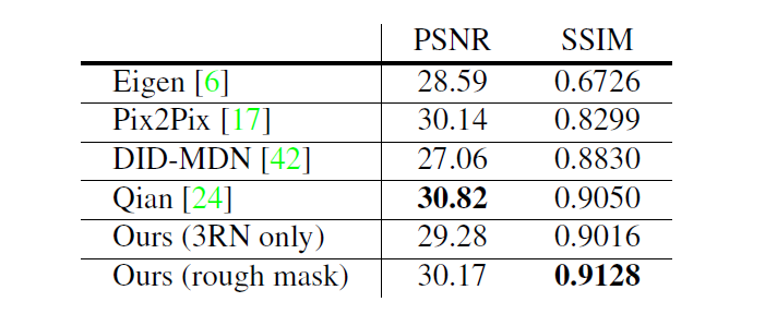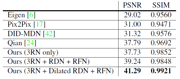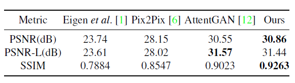 数值实验是在Qian et al.1发布的数据集上进行的。对比试验是Eigen et al2的方法,Qian et al.的AttentGAN3,以及Pix2Pix4 进行了对比试验。