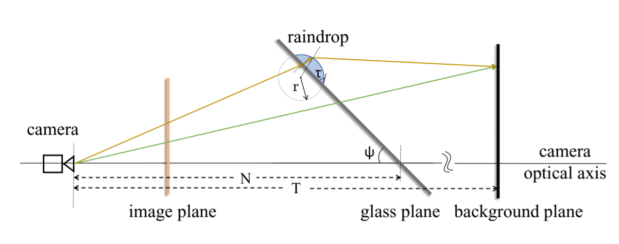 这是本文的物理模型,其中绿线代表直接射进镜头的光线,而黄线表示经过两次折射后射入镜头的光线。