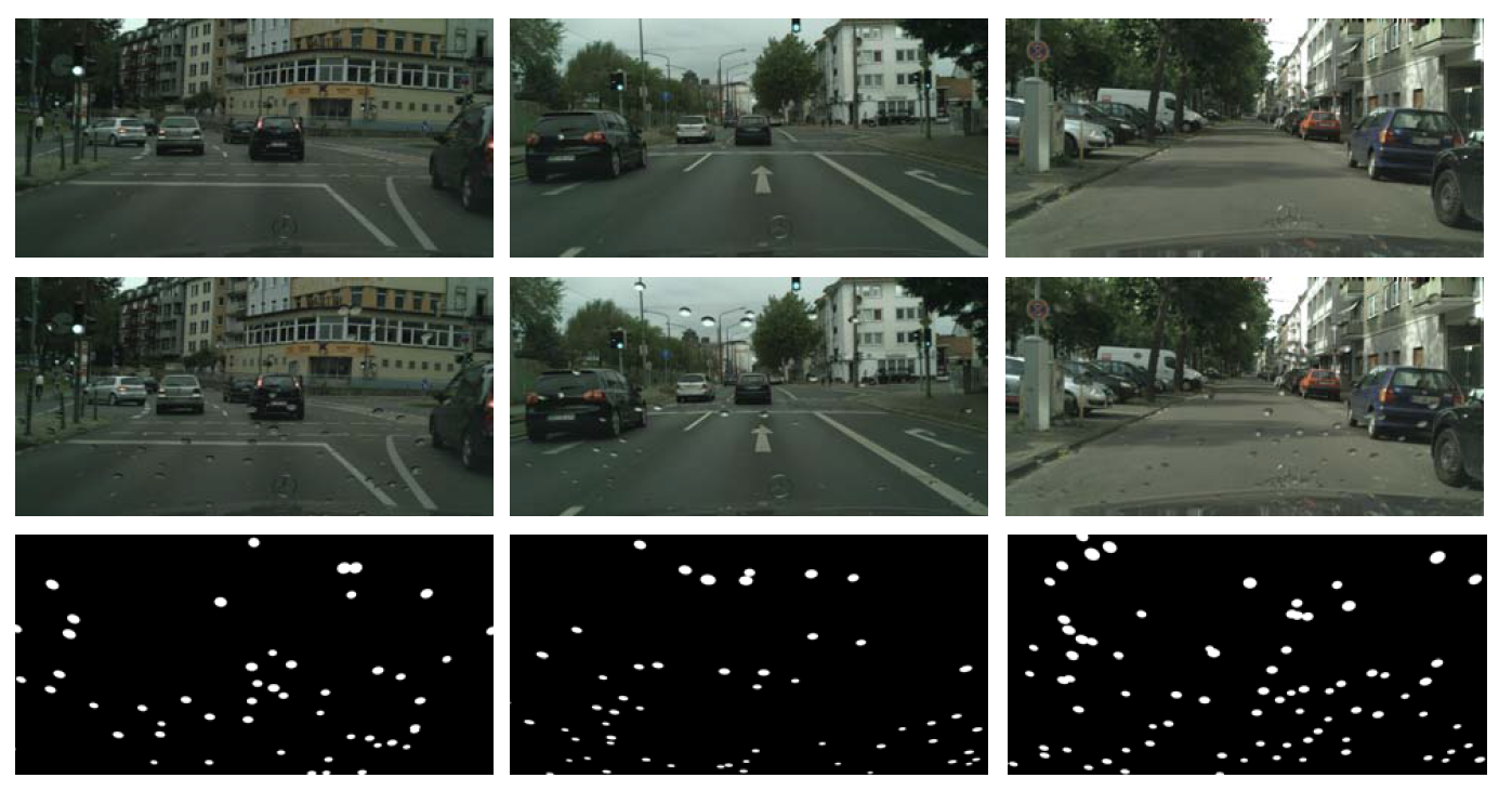 作者根据上一节的物理模型,使用几何渲染和光线追踪技术,先随机生成玻璃角度、水滴的几何形状(水滴和玻璃的夹角以及水滴的直径)和位置,然后计算出我们在玻璃后应该观察出的图像,最后,考虑到摄像机的焦面在图像上,而玻璃上的水滴不在焦平面上,所以对水滴再进行了一个disk blur。 就得到了模拟数据集,效果如下,第一到三行分别为真实图像,模拟的玻璃后图像,和模拟图像的水滴mask。