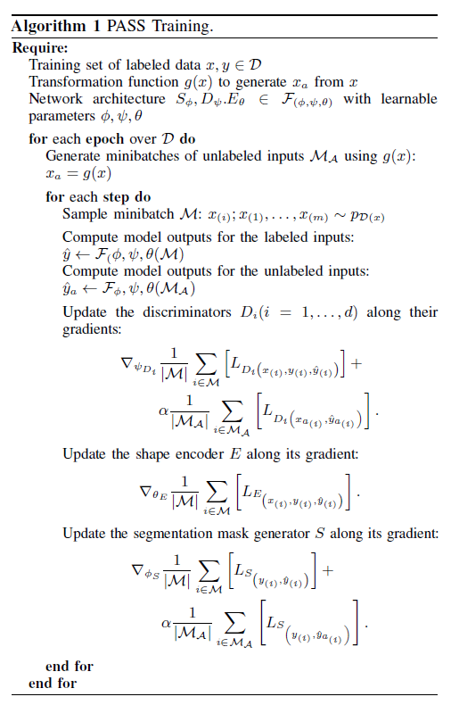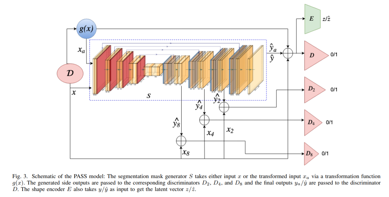 整体过程中有三个网络,Discriminators D, segmentation mask generator S和shape encoder E。